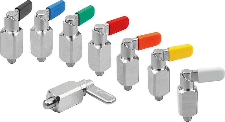 Note:The square sleeve makes these plungers suitable for welding. To prevent overheating the spring, positioning with spot welding is recommended.Advantages:Turning the grip through 180° retracts the pin.