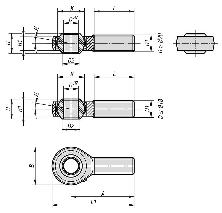 Rod ends with plain bearing, external thread, steel, DIN ISO 12240-1