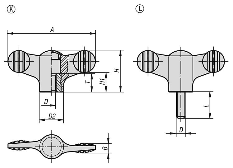 Wing grips, plastic with cap, threaded inserts steel or stainless steel