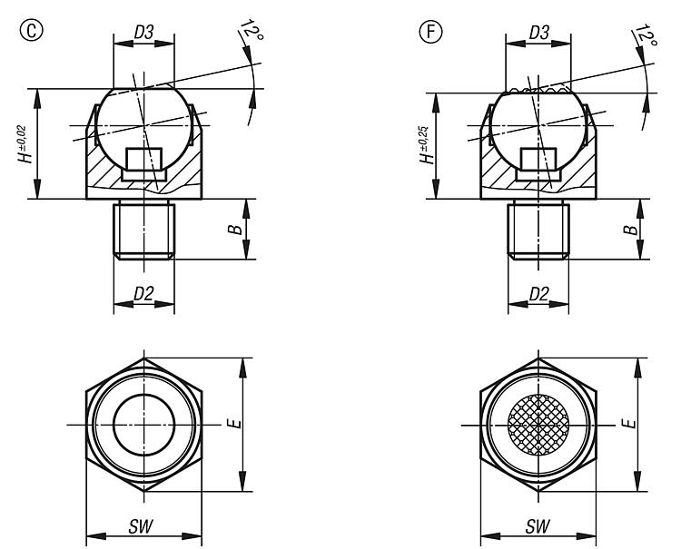 Version:Body black oxidised, ball hardened (50 - 55 HRC).Note:Self-aligning pads serve as stops, supports and thrust pads in fixture construction. They can also be installed in existing clamping devices, e.g. arness clamps.