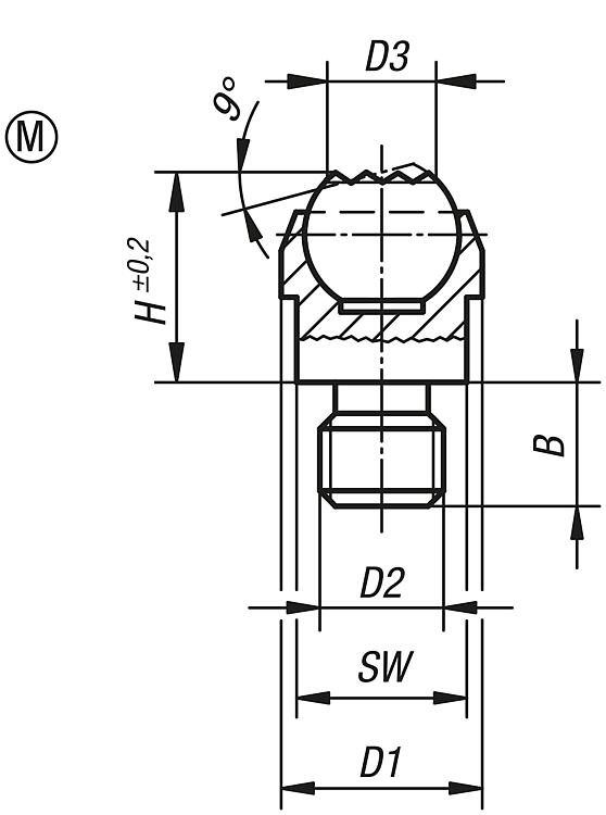 Self-aligning pads, Form M, with external thread, flattened ball, diamond grip