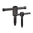 DescriptionMaterial:Steel.Version:Black oxidised. Thrust pin hardened.Note:By the thrust screws with sliding T-bar the bar is held in any desired position by a spring in the body. End stops prevent the bar falling out. By the fixed handles the T-bar is pressed in.Special features: