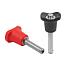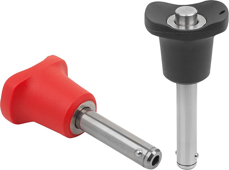 Spring 1.4310 stainless steel wire. Version:Grip black grey or traffic red RAL 3020. Stainless steel bright.Note:Ball lock pins are used for easy fastening or joining of components. The two balls are disengaged by pressing the push button and the pin can be slipped into holes in the workpieces. When the push button is released, the balls lock the connection securely.