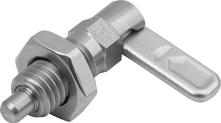 Spring 1.4310. Version:Threaded sleeve and grip bright. Indexing pin ground and left bright. Spring bright.Advantages:Turning the grip through 180° retracts the pin. 180° stop with rotation in one direction.On request:Special versions. Accessory:Mounting bracket B0065. Positioning bush B0063. Special features: DownloadHere is all the information as a PDF datasheet: