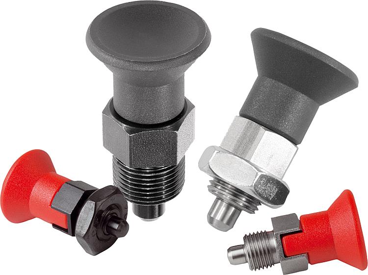 Indexing plungers, steel or stainless steel, short version with plastic mushroom grip, locking slot and locknut