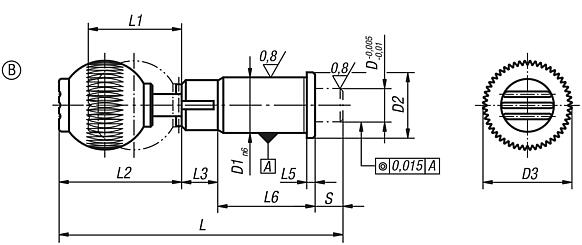 Precision indexing plungers, steel with plastic spherical knob, cylindrical indexing pin and locking slot