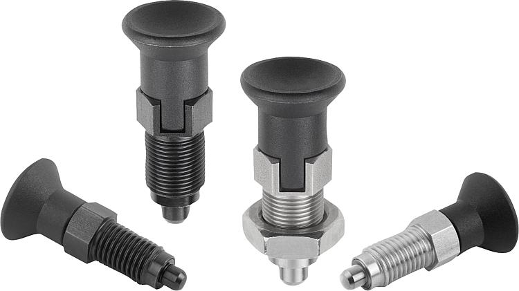 Premium - Indexing plungers, steel or stainless steel with plastic mushroom grip, cylindrical indexing pin, locking slot and locknut