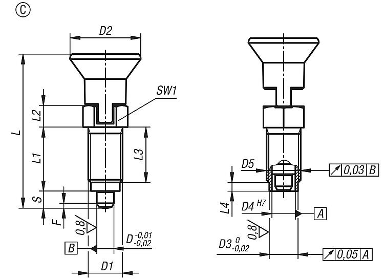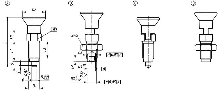 DescriptionProduct description:Indexing plungers are used where any change in locking position due to lateral forces should be prevented. A new indexed position can be only be moved to after the pin has been manually retracted. Form C and D are recommended for applications where the indexing pin should remain disengaged for an extended period and be prevented from springing back.