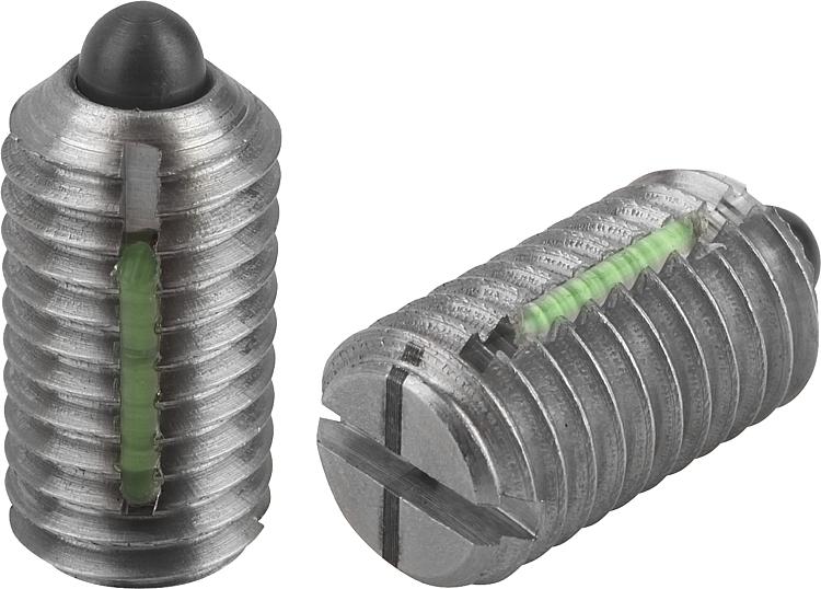 Spring plungers with slot and thrust pin, stainless steel, light spring force, with thread lock