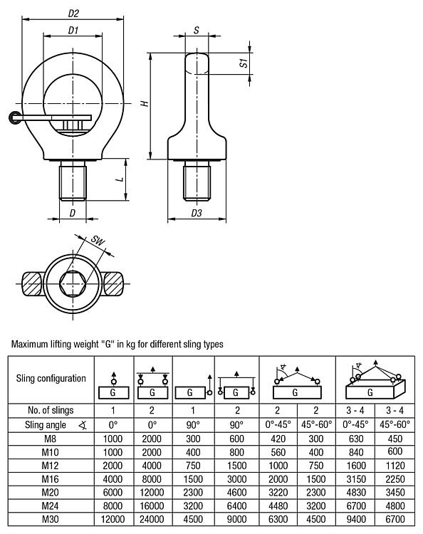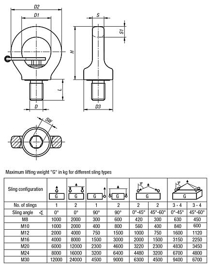 Note:In contrast to DIN 580 ring bolts this ring bolt is rotatable, therefore the load direction is adjustable and unintended tightening or loosening is negated.