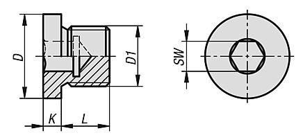 DescriptionMaterial:Steel.Version:Electro zinc-plated.Note:Screw plugs with collar and hexagon socket for plugging holes with parallel threads.
