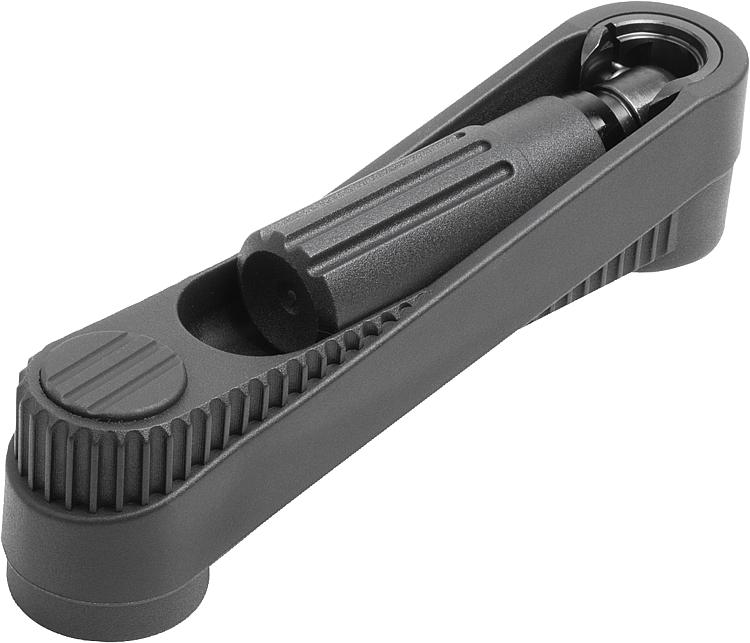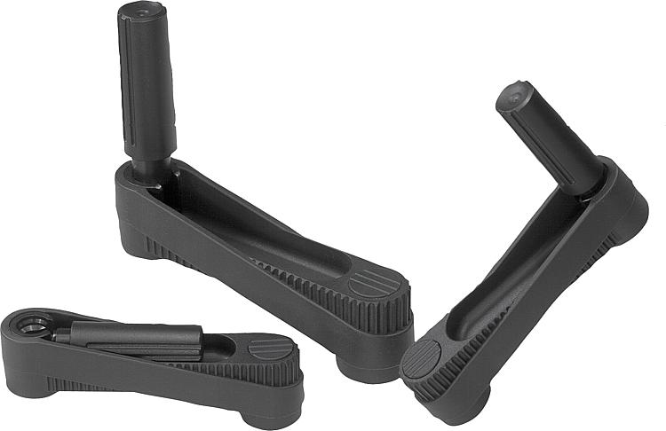 DescriptionMaterial:Crank thermoplastic. Cylinder grip thermoplastic and steel.Version:Black grey thermoplastic. Steel parts black oxidised.Note:The hub cover is supplied unassembled. Two actions must be made to bring the safety cylinder grip into an operating position: - Swing the grip out around the pivot shaft until it stops (90°). - Push the grip in an axial direction into the lock position. The pushed-in position is the most comfortable for cranking. The grip swings back automatically after releasing. Versions with transverse bore are secured using the ISO 4027 (DIN 914) grub screw.Accessory:B0127 cap screws screws, low head DIN 6912.Drawing reference:1) Position of the transverse bore to the keyway is offset by 90°. Special features: DownloadHere is all the information as a PDF datasheet: